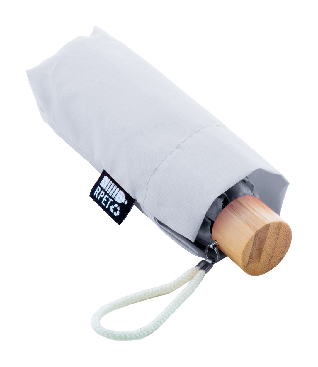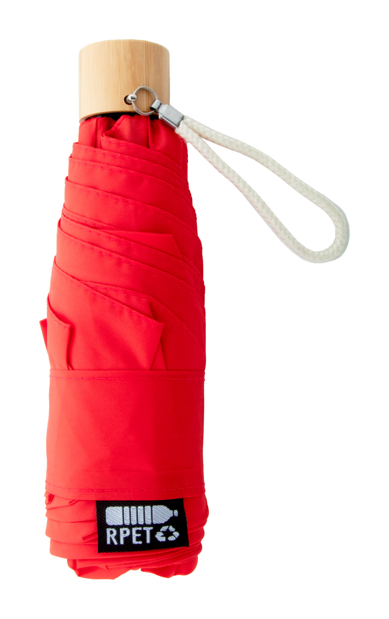 Manuálny vetruodolný 3-skladací mini dáždnik s 6 panelmi v puzdre v zodpovedajúcej farbe. S kovovým rámom, sklolaminátovými rebrami, bambusovou rukoväťou a bavlneným remienkom na ruku. 190T RPET pongee, s výrazným štítkom RPET.