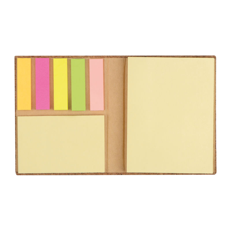 Poznámkový blok s rôznymi farebnými samolepiacimi pásikmi a s obalom z korku.