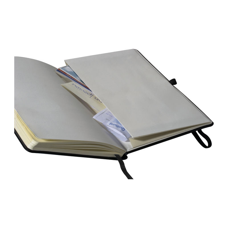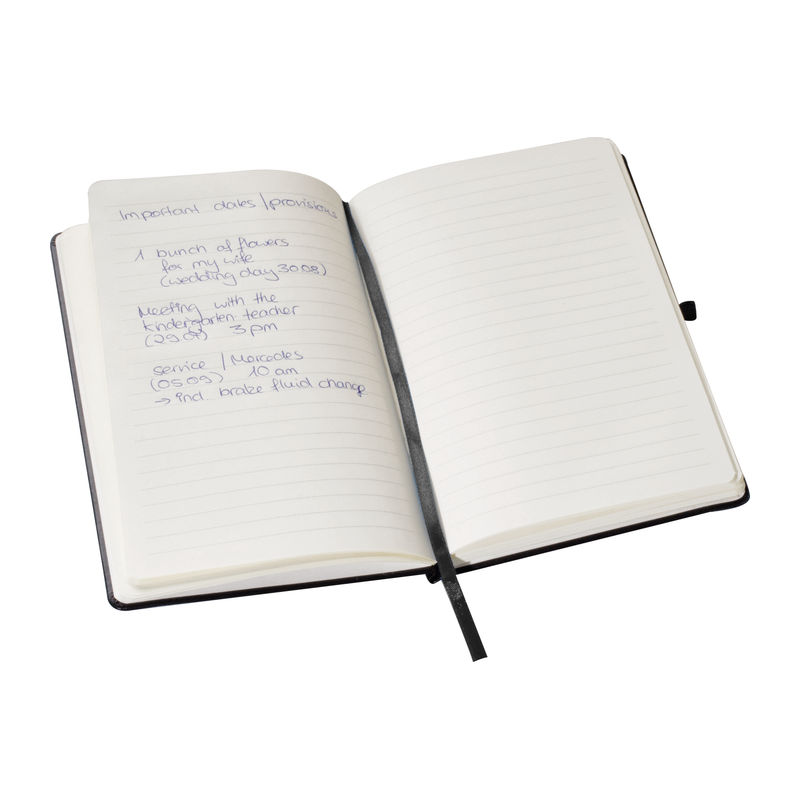 Linajkovaný poznámkový blok s elastickou gumou na uzavretie, záložkovou stuhou, slučkou na pero a koženkovým povrchom. Obsahuje 160 linajkovaných strán (80 listov).