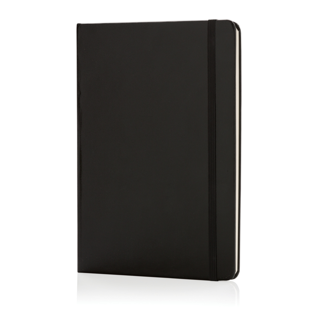 Linajkovaný základný zápisník A5 s tvrdým obalom, elastickým uzáverom a záložkovou stuhou. 144 strán 70 g/m2 vnútri. Krémovo sfarbené strany.