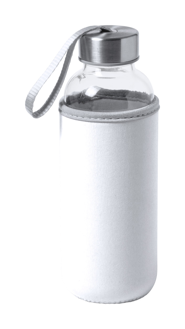 Sklenená športová fľaša s bambusovým viečkom a bielym neoprénovým obalom, 420 ml.