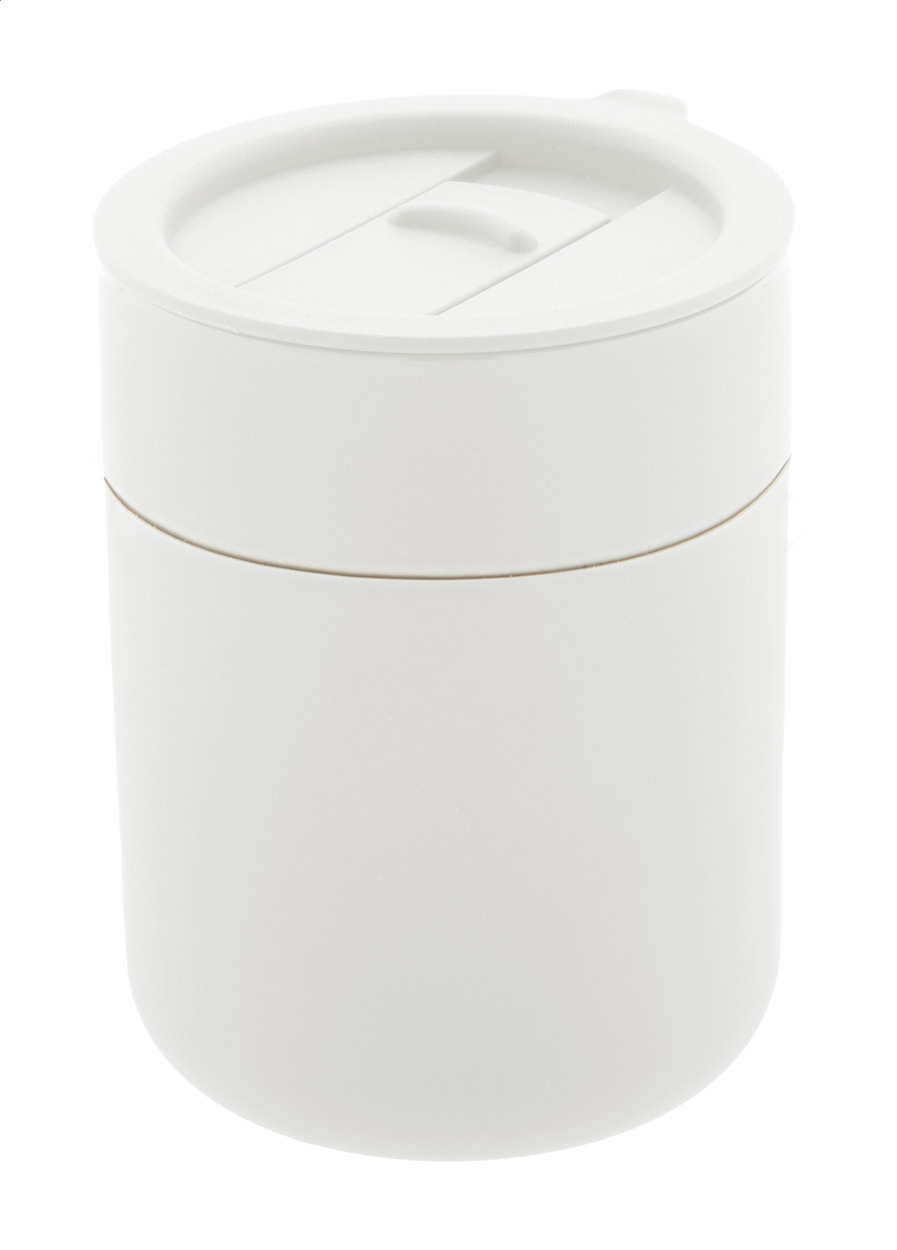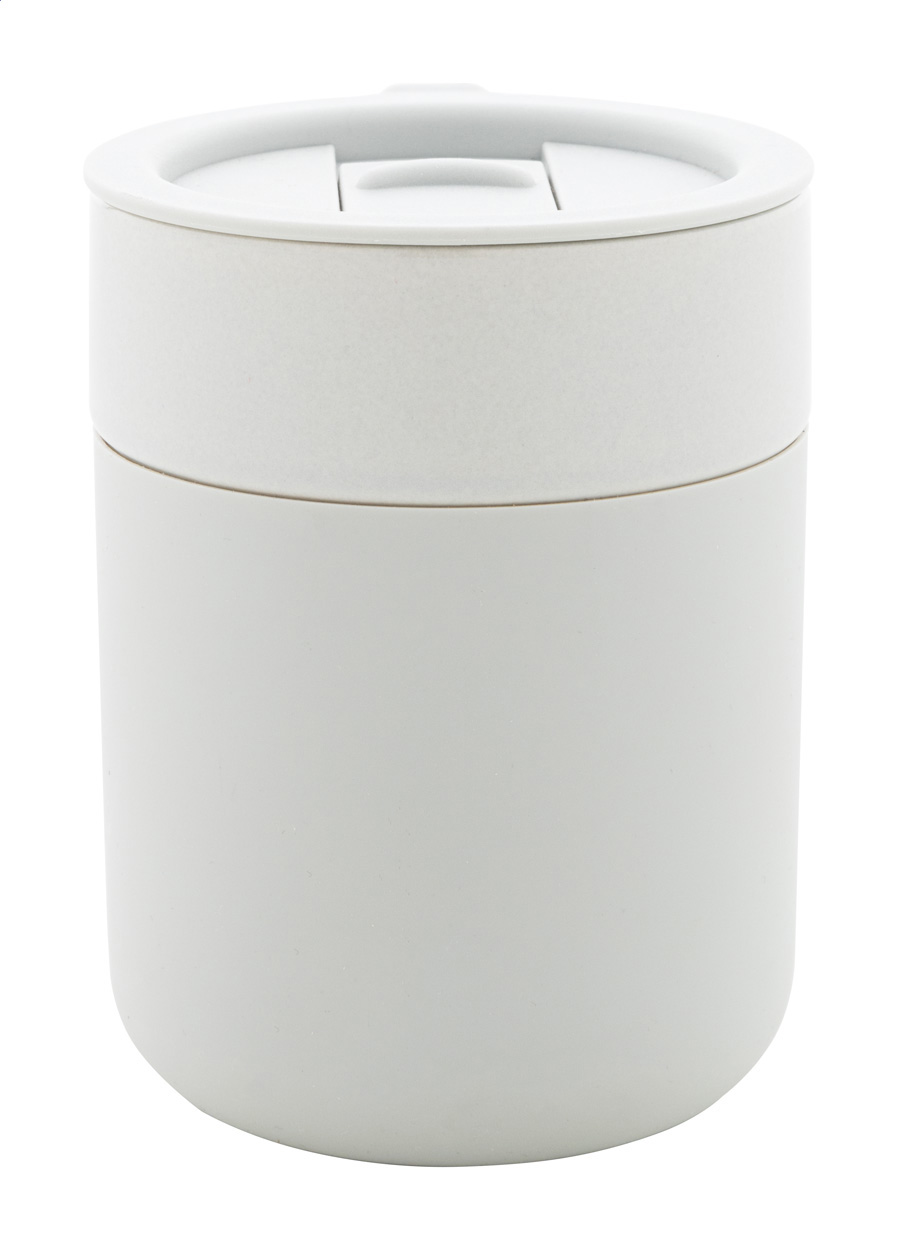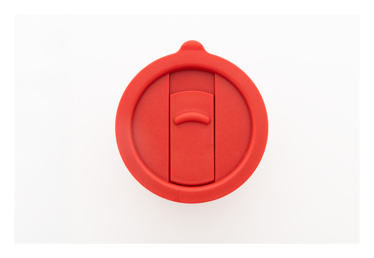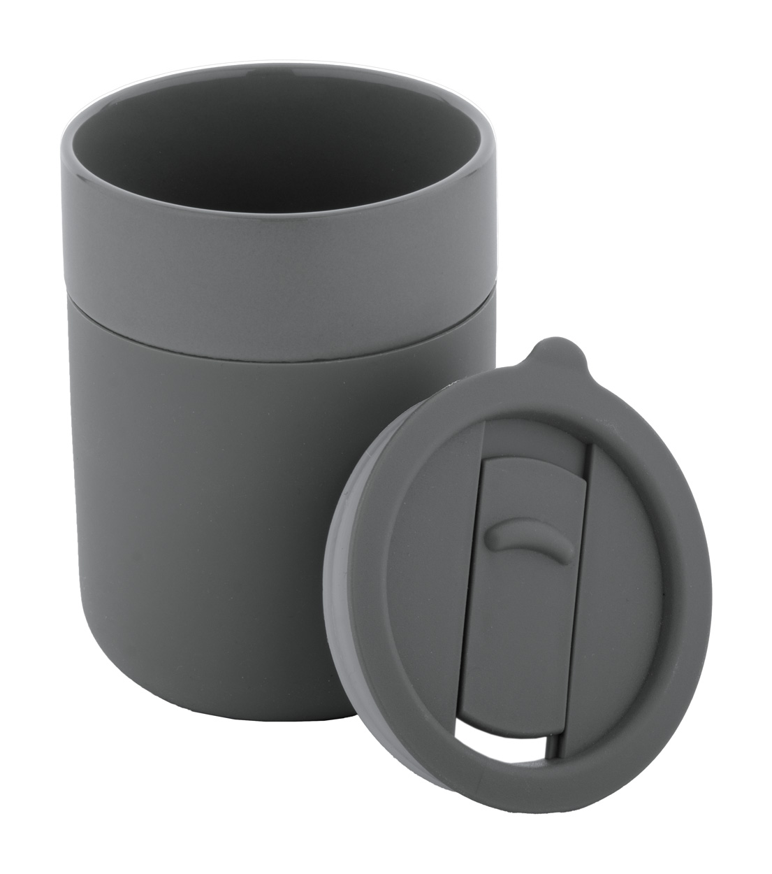 Silikónom potiahnutý keramický cestovný kelímok s PP plastovým odkvapkávacím viečkom. 300 ml.