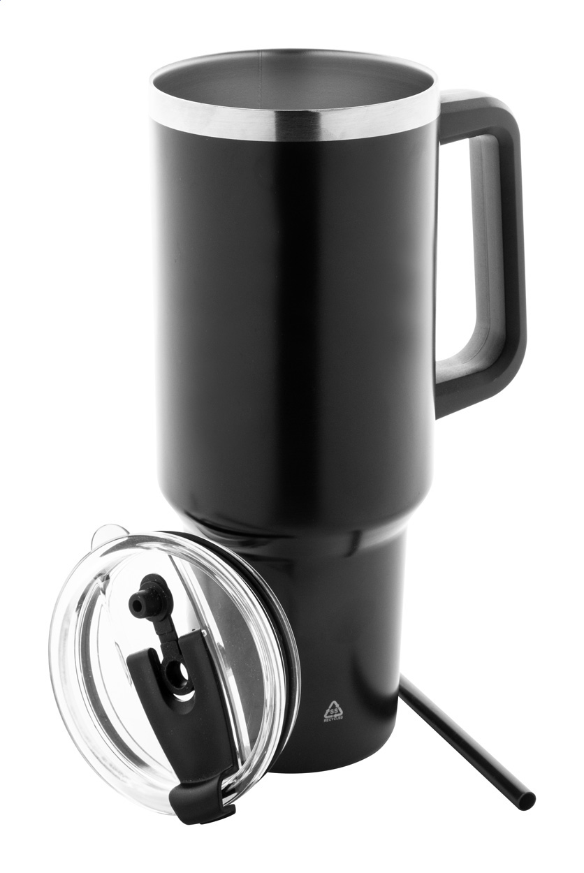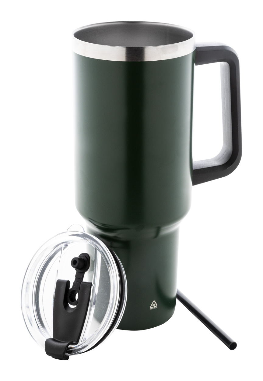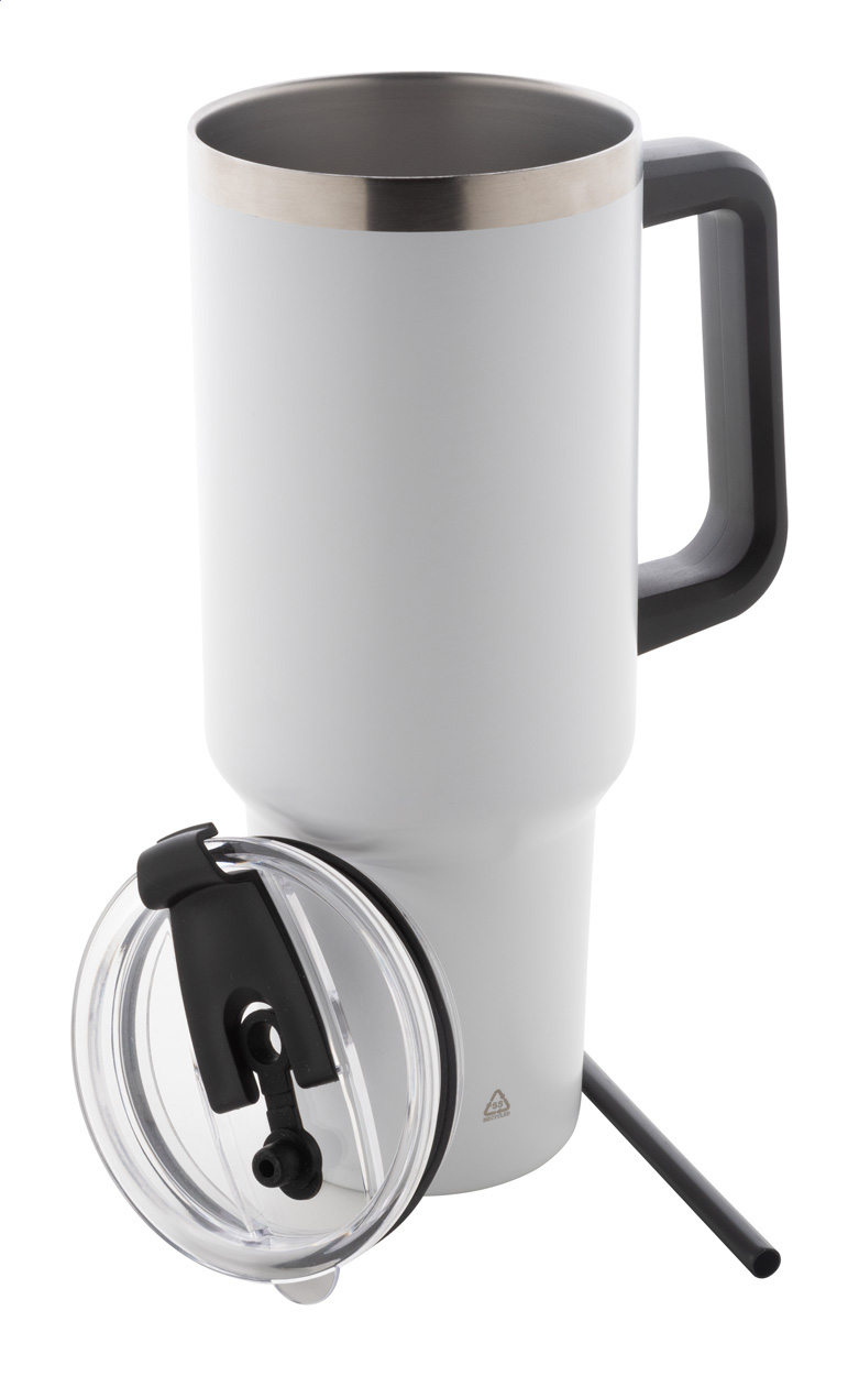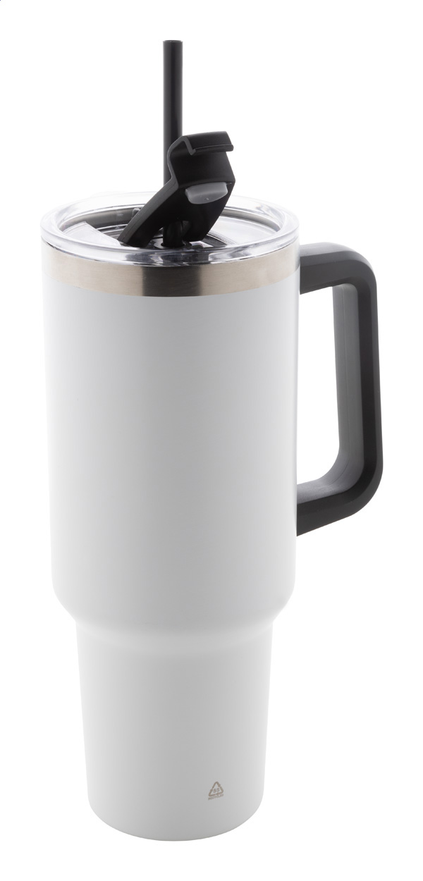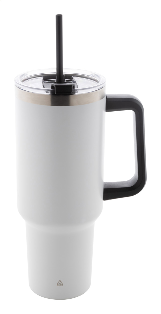 Dvojplášťový vákuovo izolovaný termo hrnček z recyklovanej nerezovej ocele s PS viečkom na pitie a PP slamkou. 1200 ml.