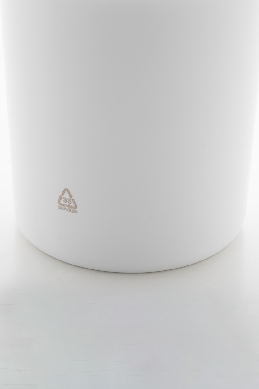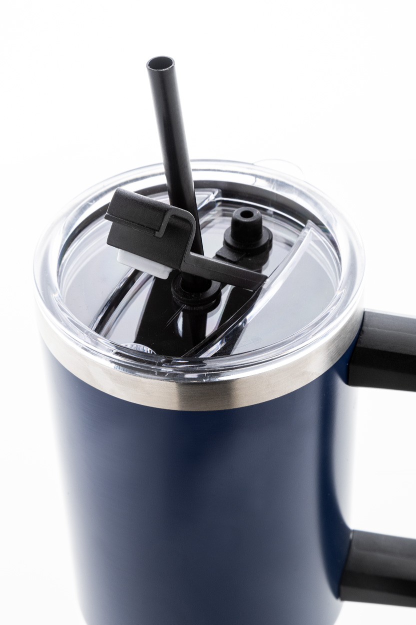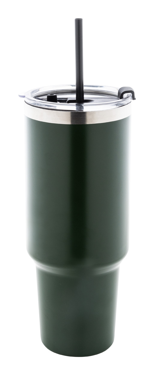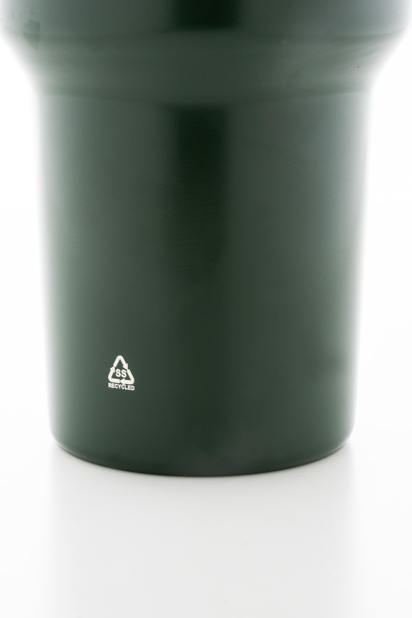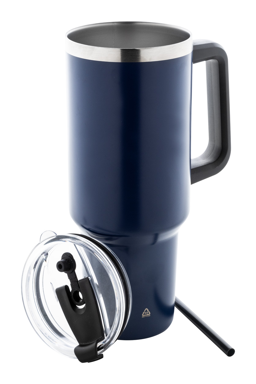 Dvojplášťový vákuovo izolovaný termo hrnček z recyklovanej nerezovej ocele s PS viečkom na pitie a PP slamkou. 1200 ml.