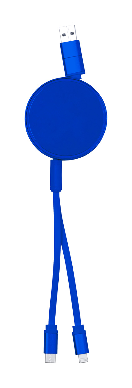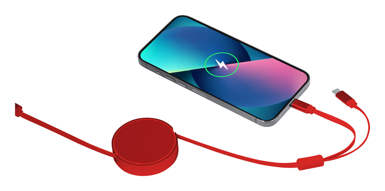 Teleskopický USB nabíjací kábel z recyklovaného hliníka. S konektormi micro USB, USB-C a Lightning. So vstupmi USB a USB-C.
