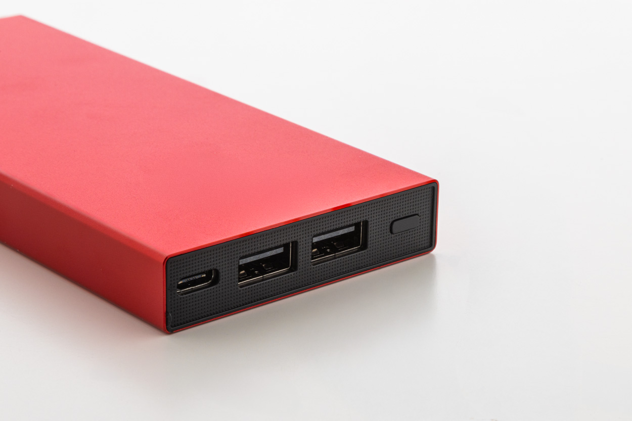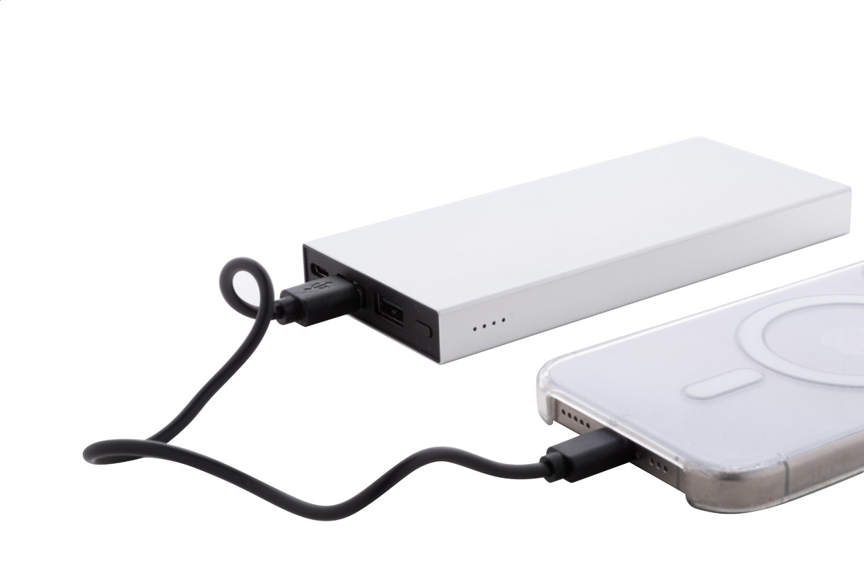 Power banka z recyklovaného hliníka s 10000 mAh batériou. S 2 portami USB a 1 portom USB-C pre nabíjačku. Vstupný port USB-C. Vrátane USB nabíjacieho kábla.