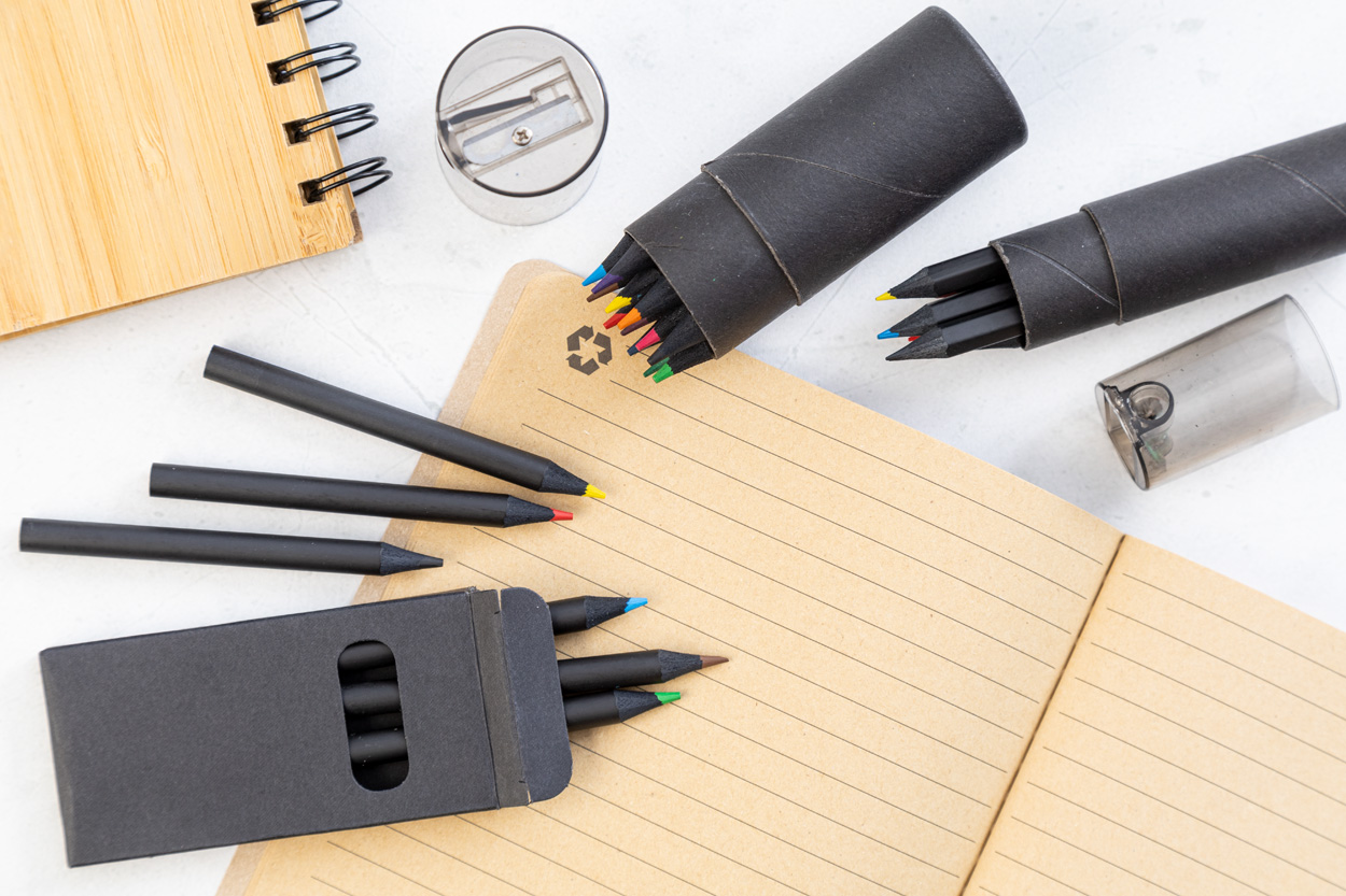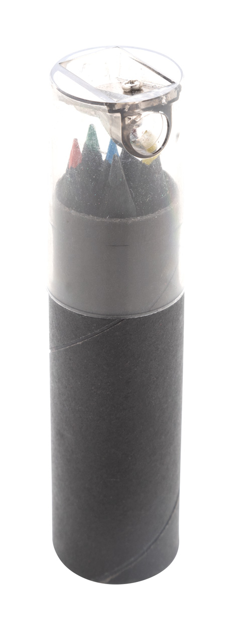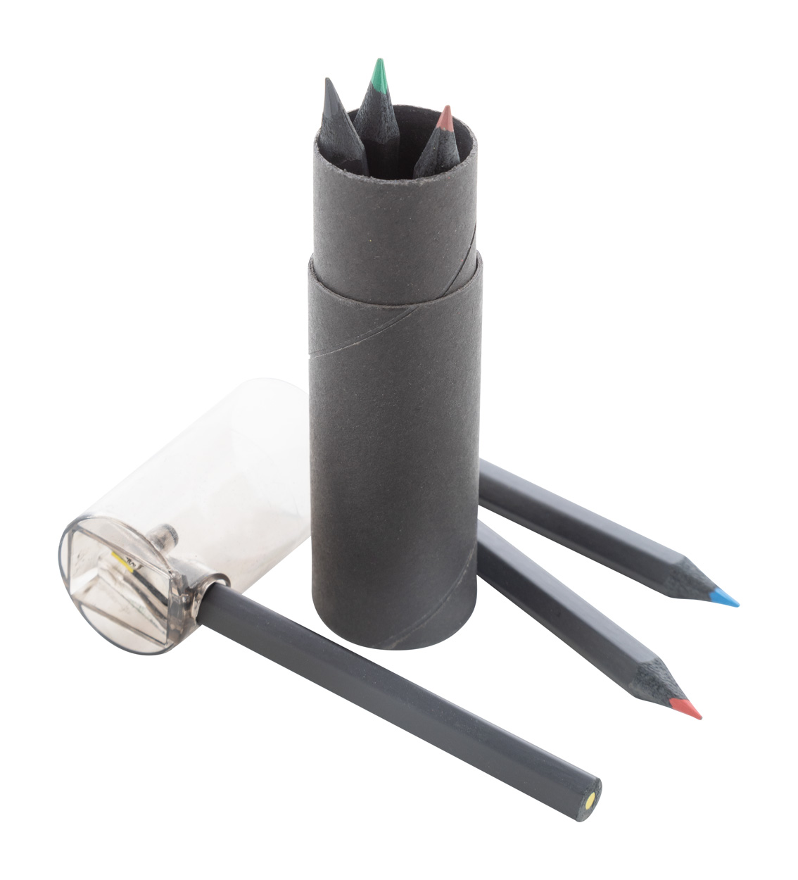 6dielna sada pasteliek z čierneho dreva v okrúhlom čiernom puzdre z kartónu s plastovým strúhadlom.