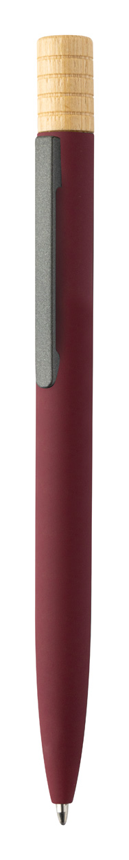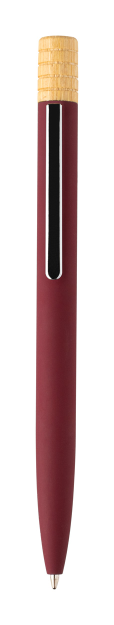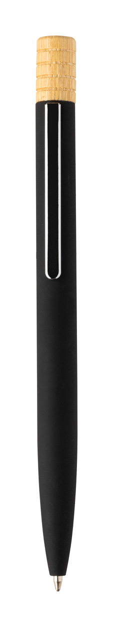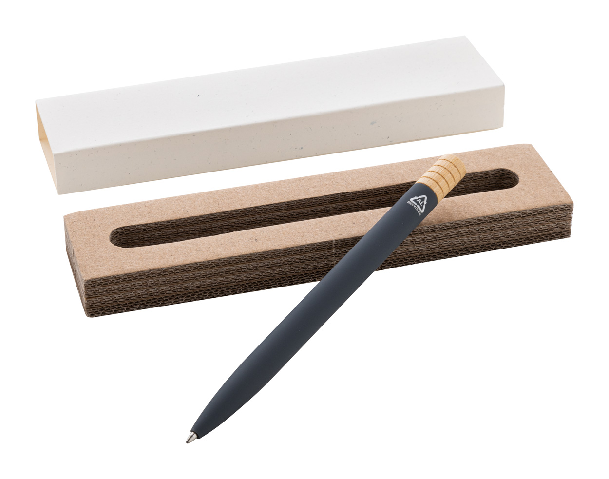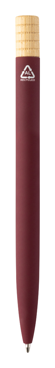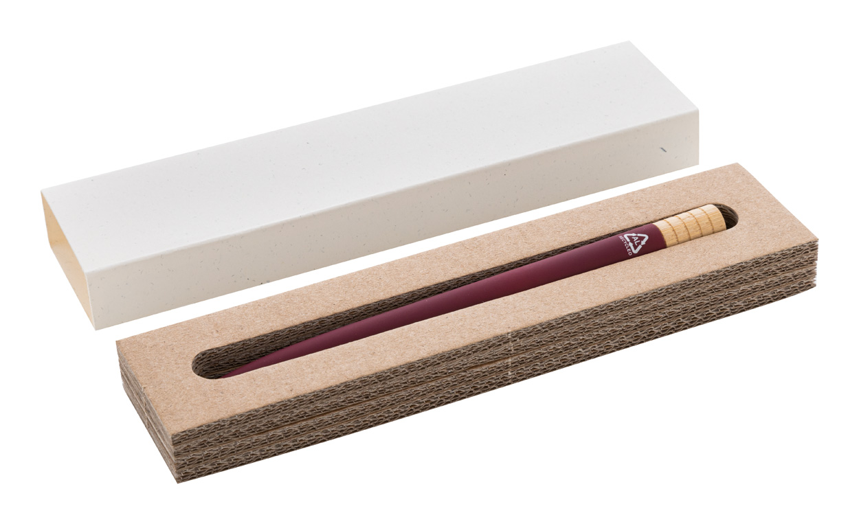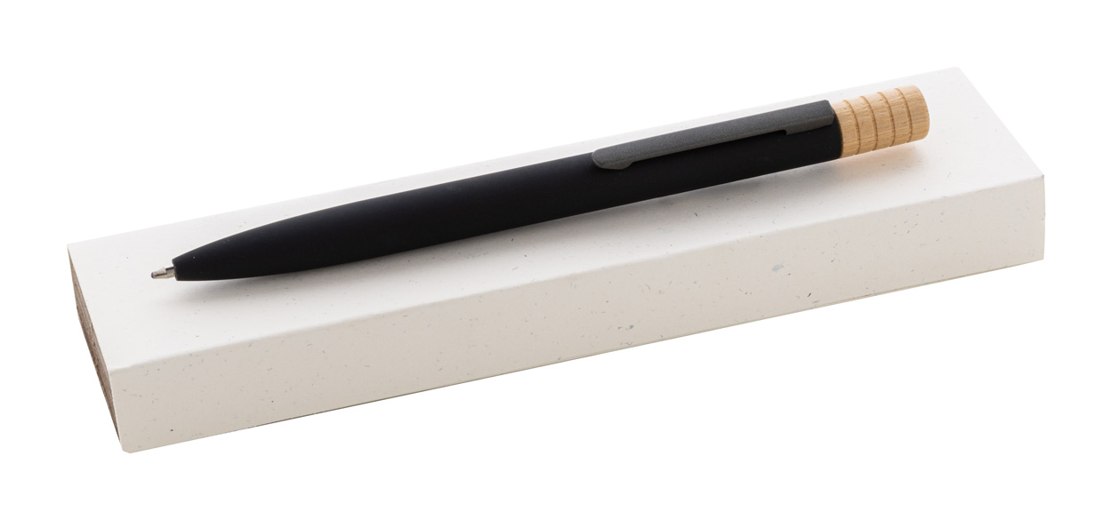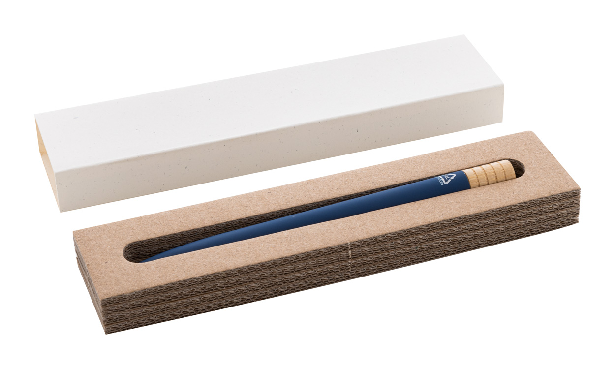Guľôčkové pero z recyklovaného hliníka s kovovým klipom a bambusovým vrškom. S modrou náplňou. V kraftovej papierovej krabičke.