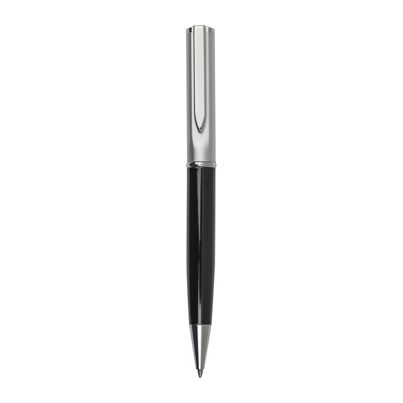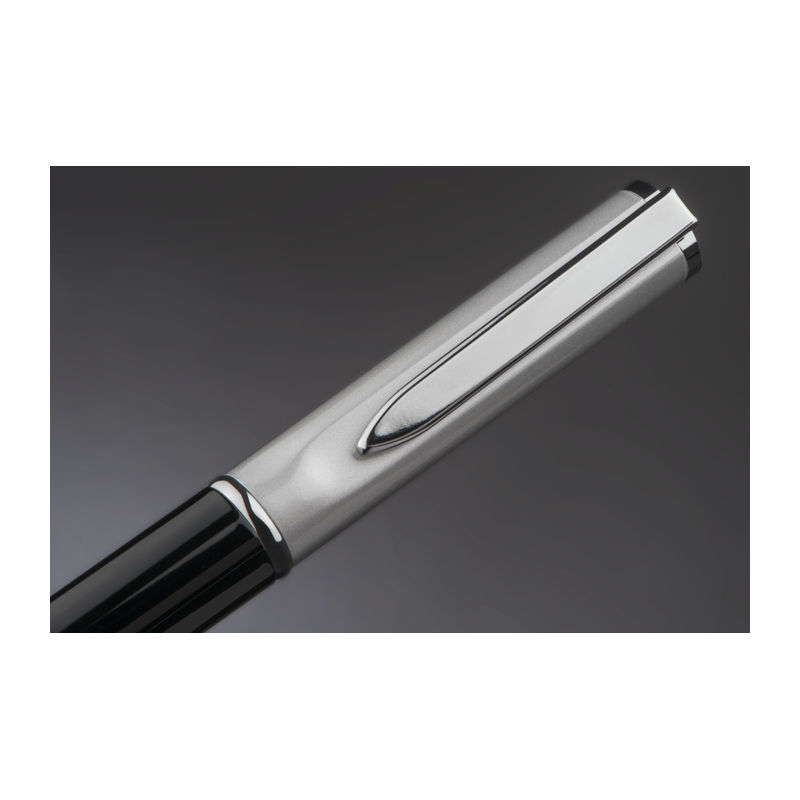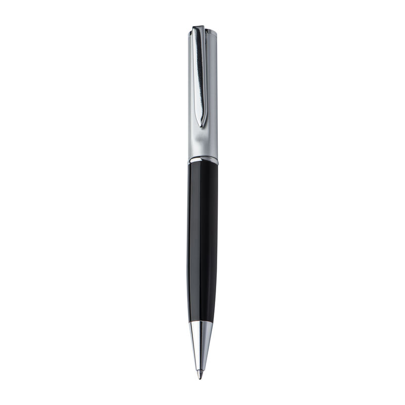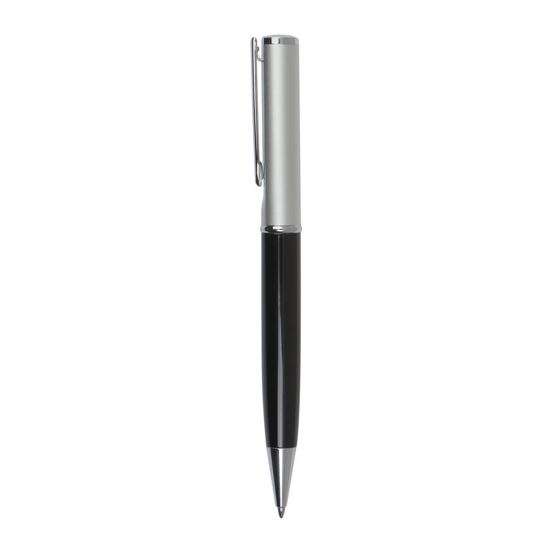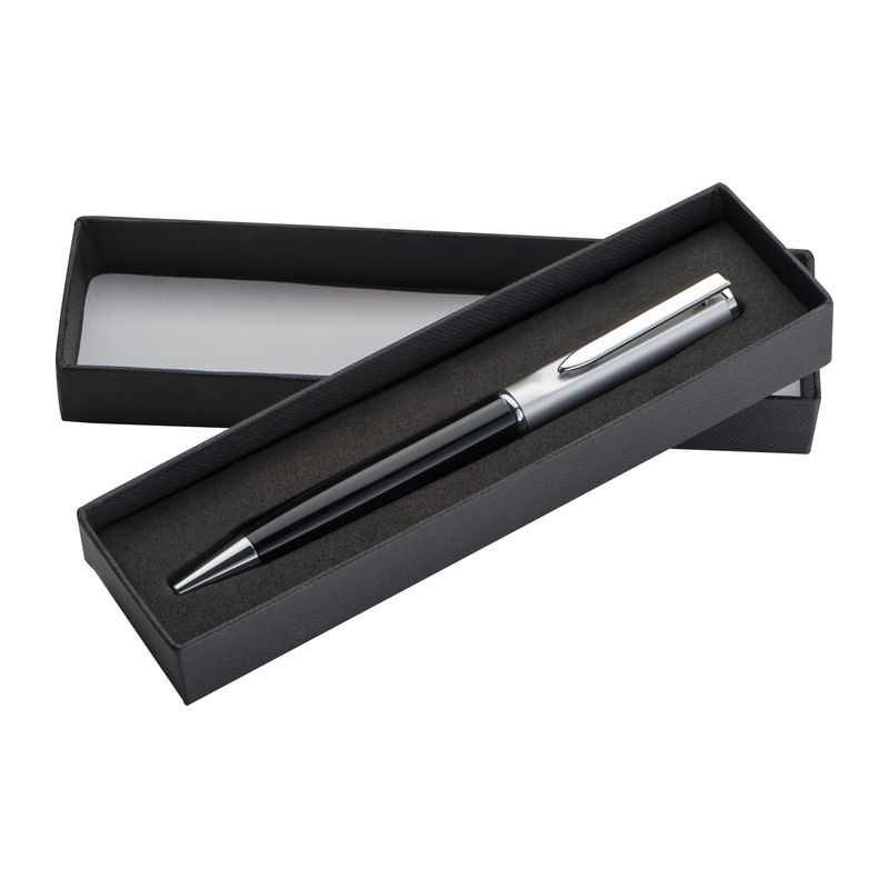 Elegantné kovové guľôčkové pero so striebornou vrchnou časťou a modrou náplňou. Pero je dodávané v papierovej darčekovej krabičke.