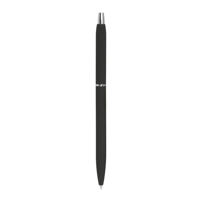 Štíhle kovové guľôčkové pero so strieborným klipom, gumeným povrchom a modrou náplňou.