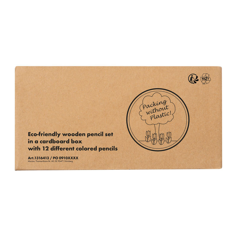 Ekologická sada drevených farbičiek v kartónovej škatuľke s 12 pastelkami rôznych farieb.