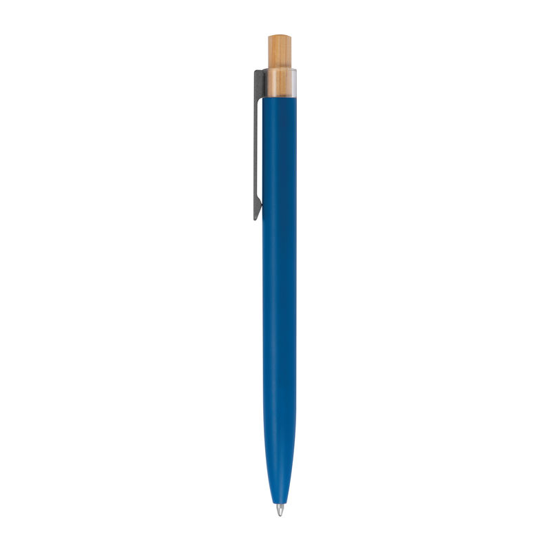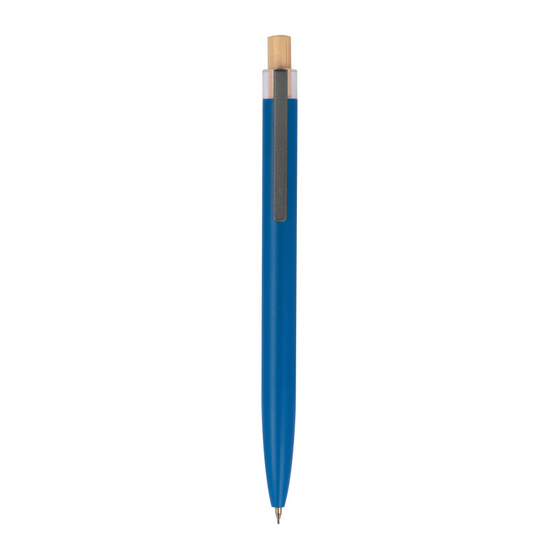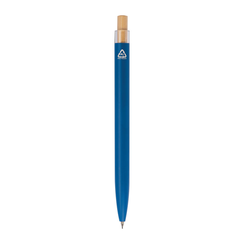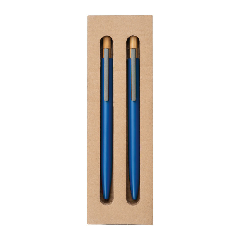 Písací set obsahujúci guľôčkové pero s modrou náplňou Semi-Gel a mechanickú ceruzku, z recyklovaného hliníka, s kovovým klipom a bambusovým tlačidlom v ekologickej krabičke.