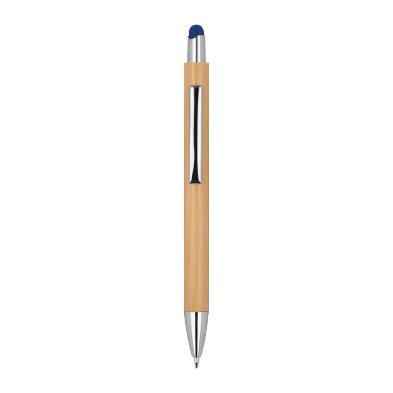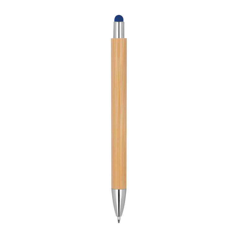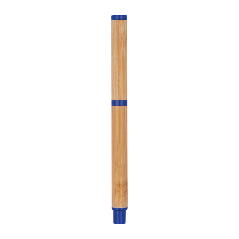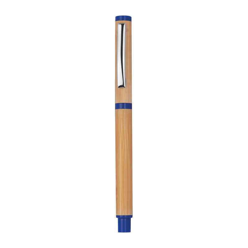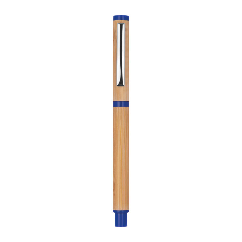 Sada na písanie pozostávajúca z modrého guľôčkového pera a z rollerového pera z bambusu so striebornými a farebnými aplikáciami. Sada je dodávaná v ekologickej kartónovej krabici.