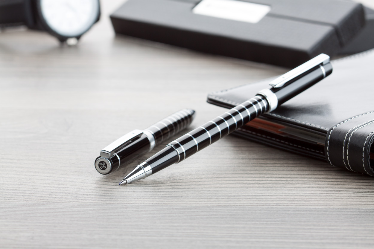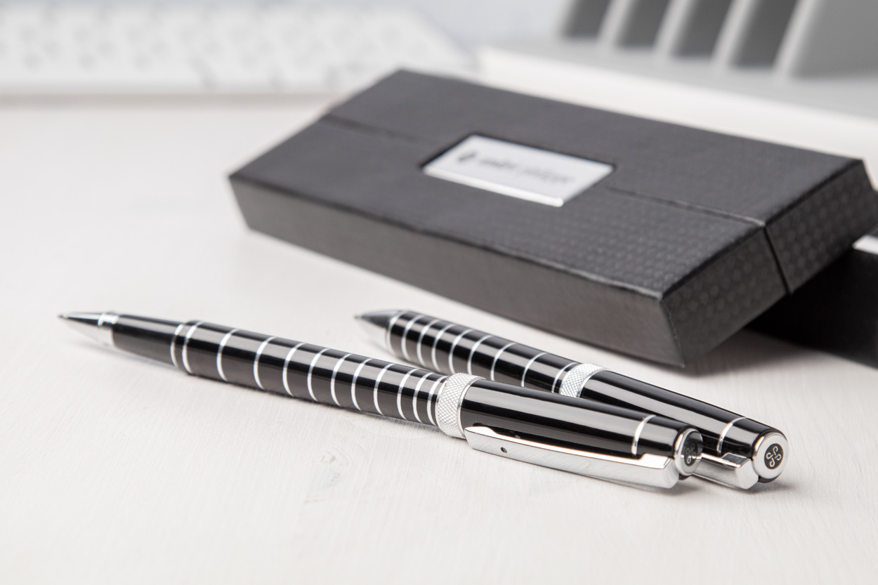 Elegantná sada hliníkového guľôčkového pera a roller pera s lesklým povrchom s chrómovanými krúžkami. V čiernom darčekovom balení s modrou náplňou. Značkový produkt André Philippe.
