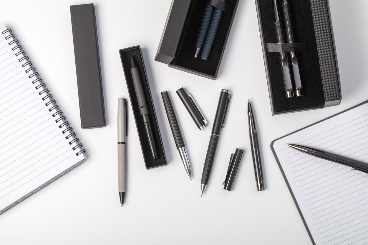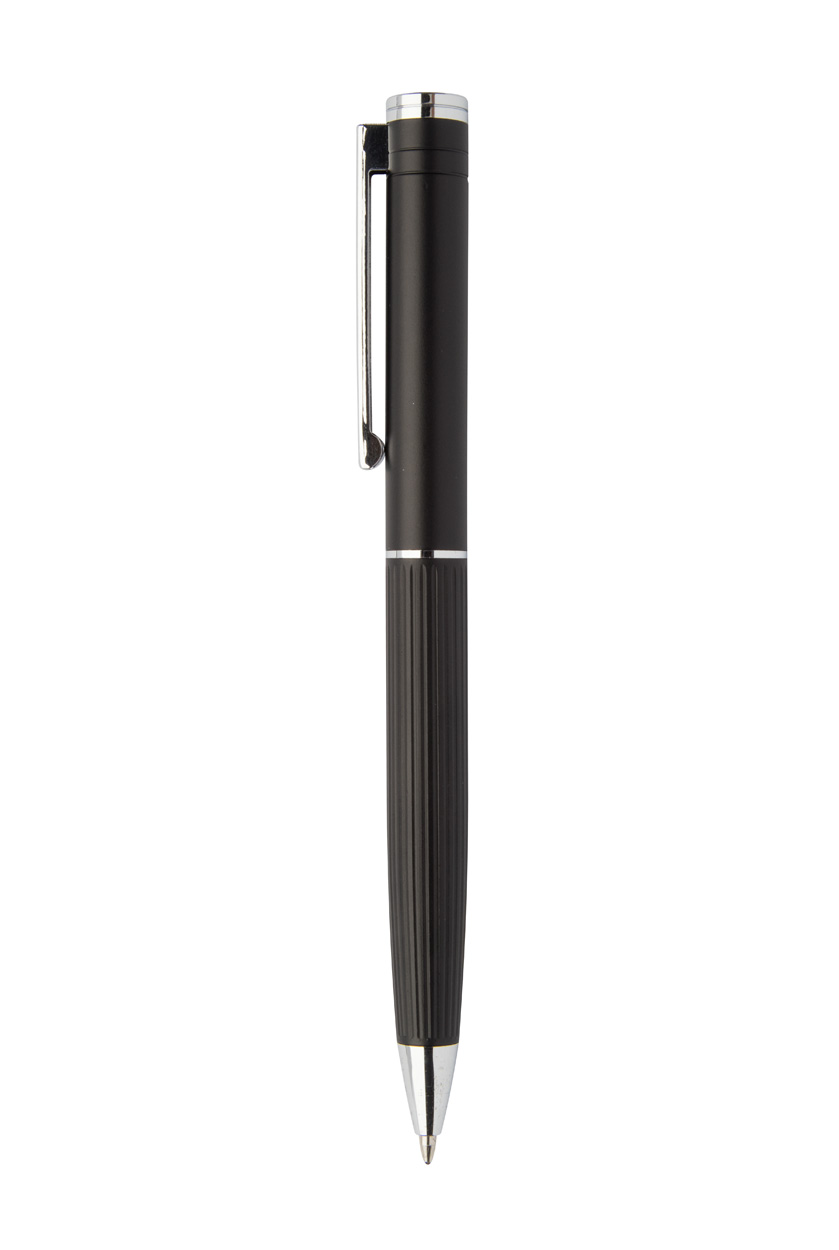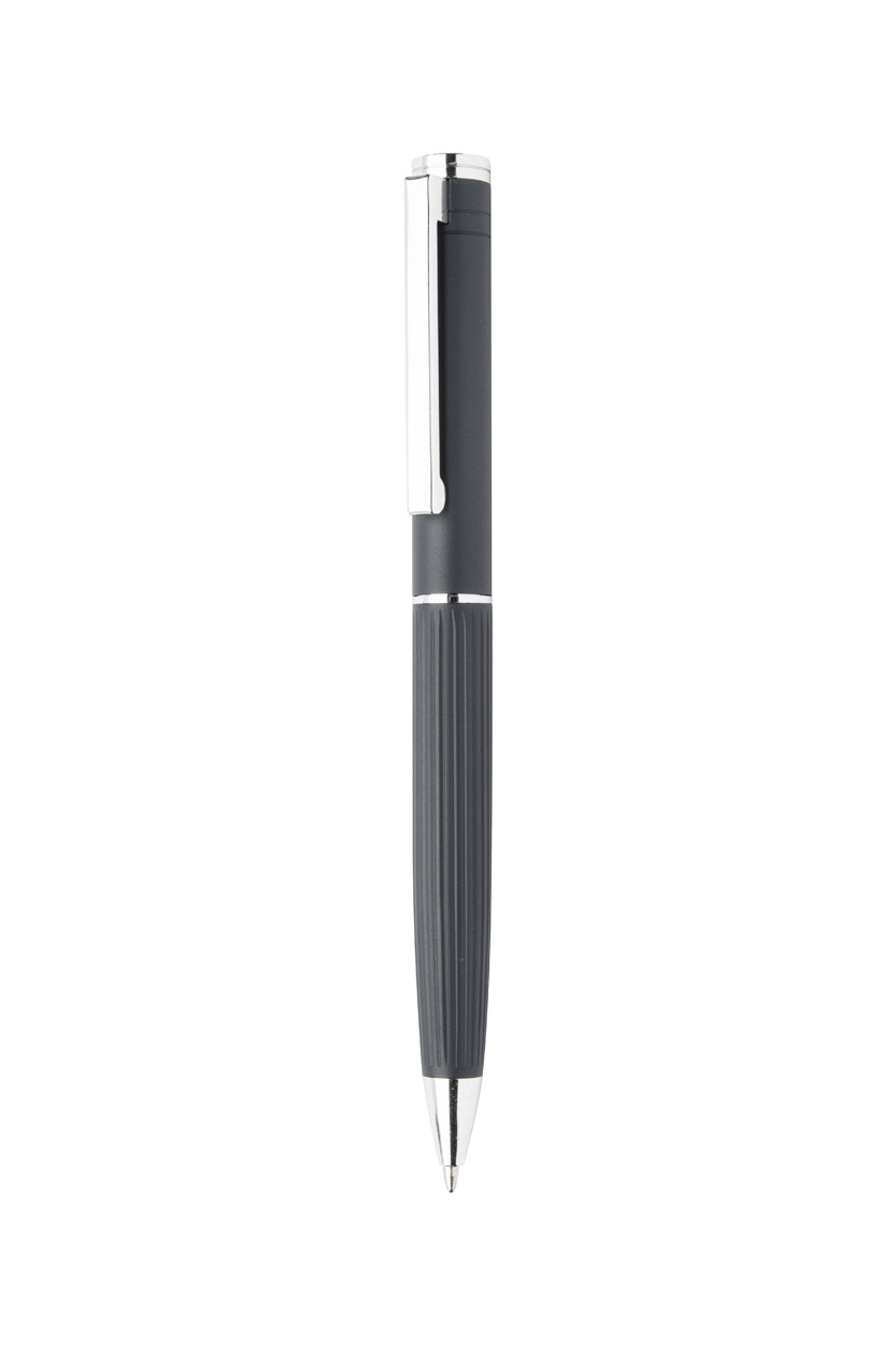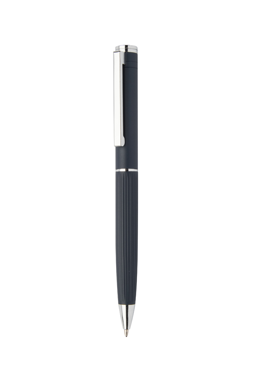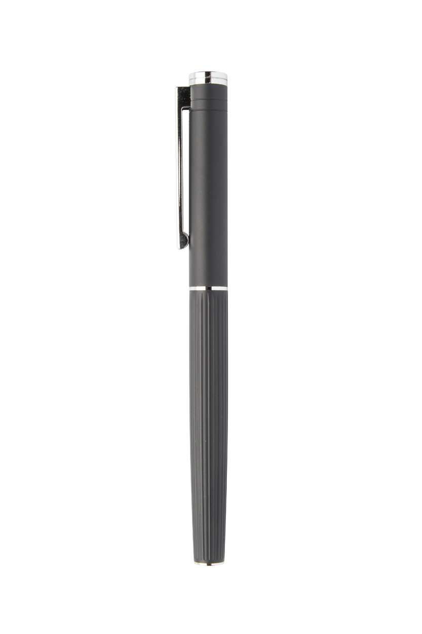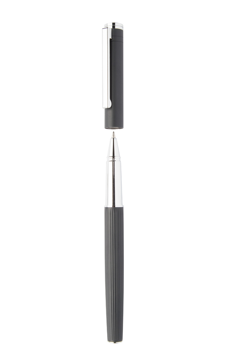 Elegantná sada hliníkového guľôčkového pera a rollera s prúžkovaným tubusom. V čiernej darčekovej krabičke, s modrou náplňou.
