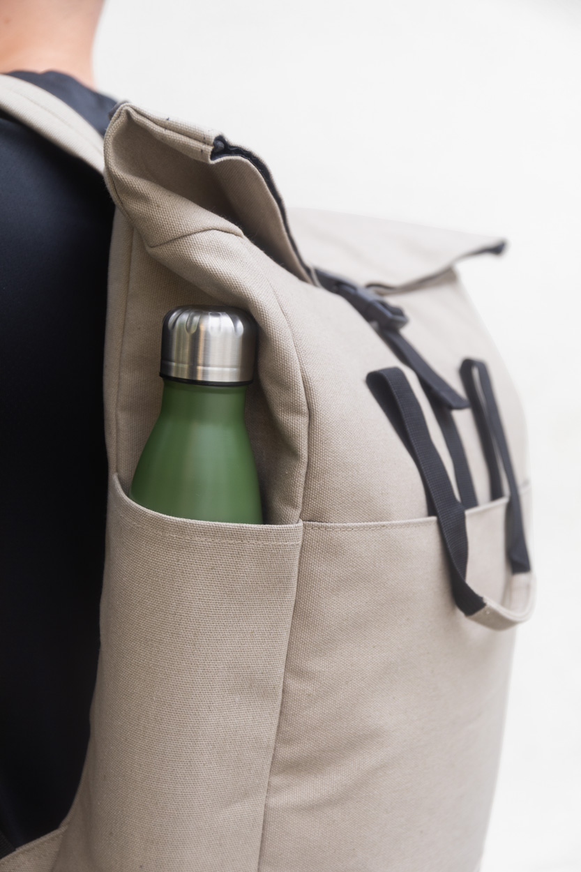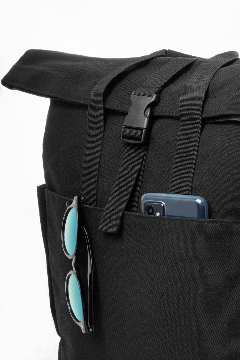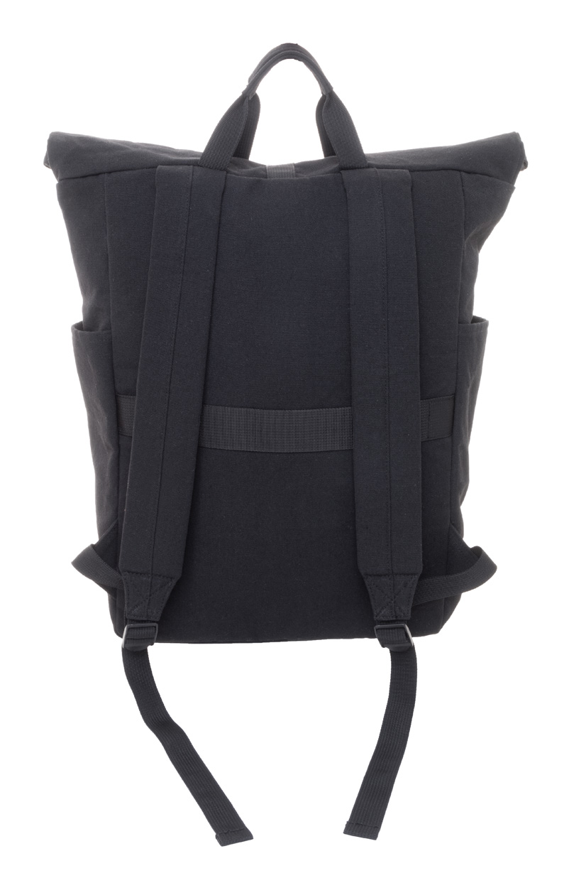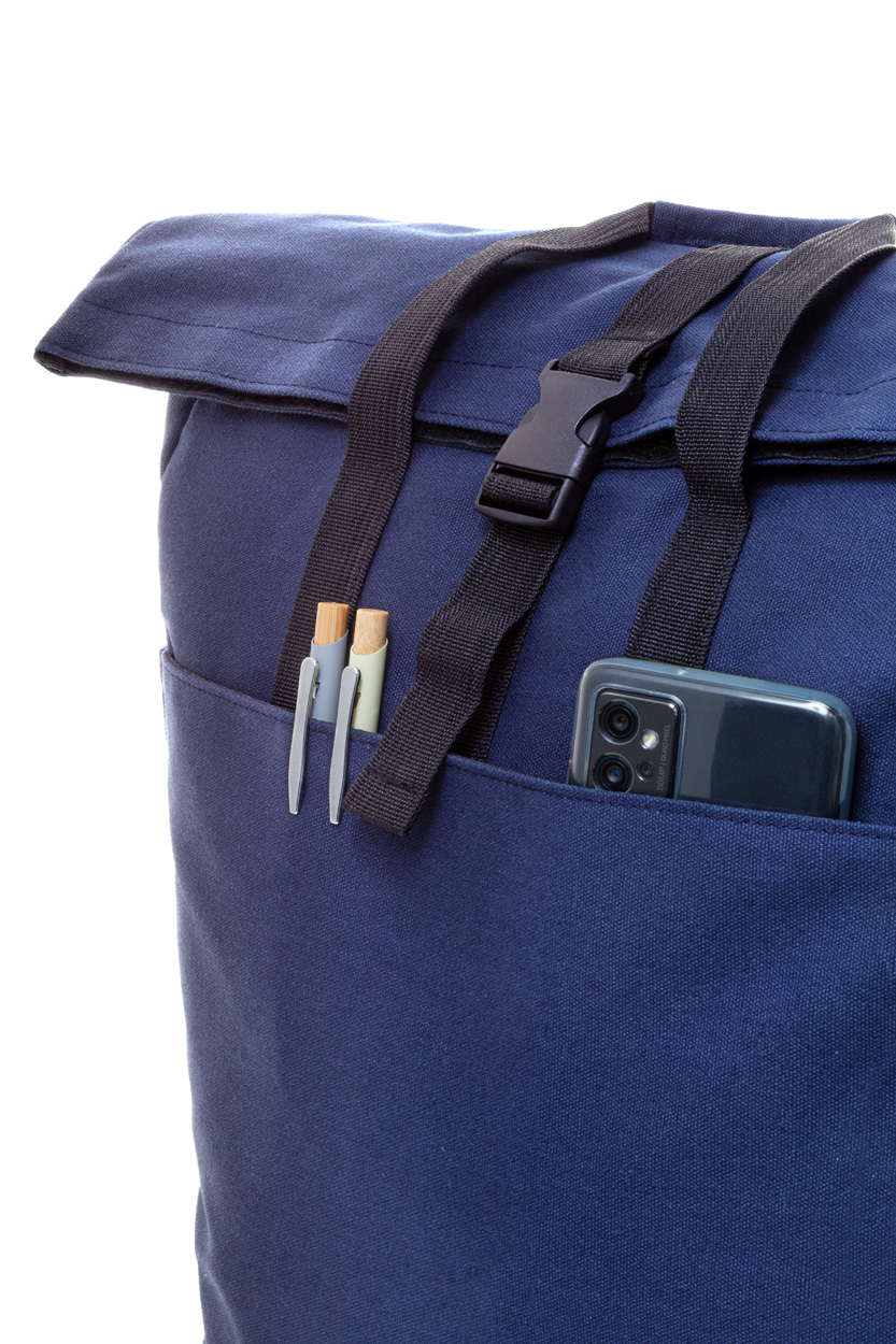 Rolovací batoh z recyklovaného plátna so zapínaním na pracku a suchý zips, polstrovaná priehradka na notebook (15″), predné a bočné vrecká. S popruhom na vozík, polstrovaný chrbát a ramenné popruhy. 70% recyklovanej bavlny a 30% RPET polyesteru. S výrazným štítkom z recyklovanej bavlny.