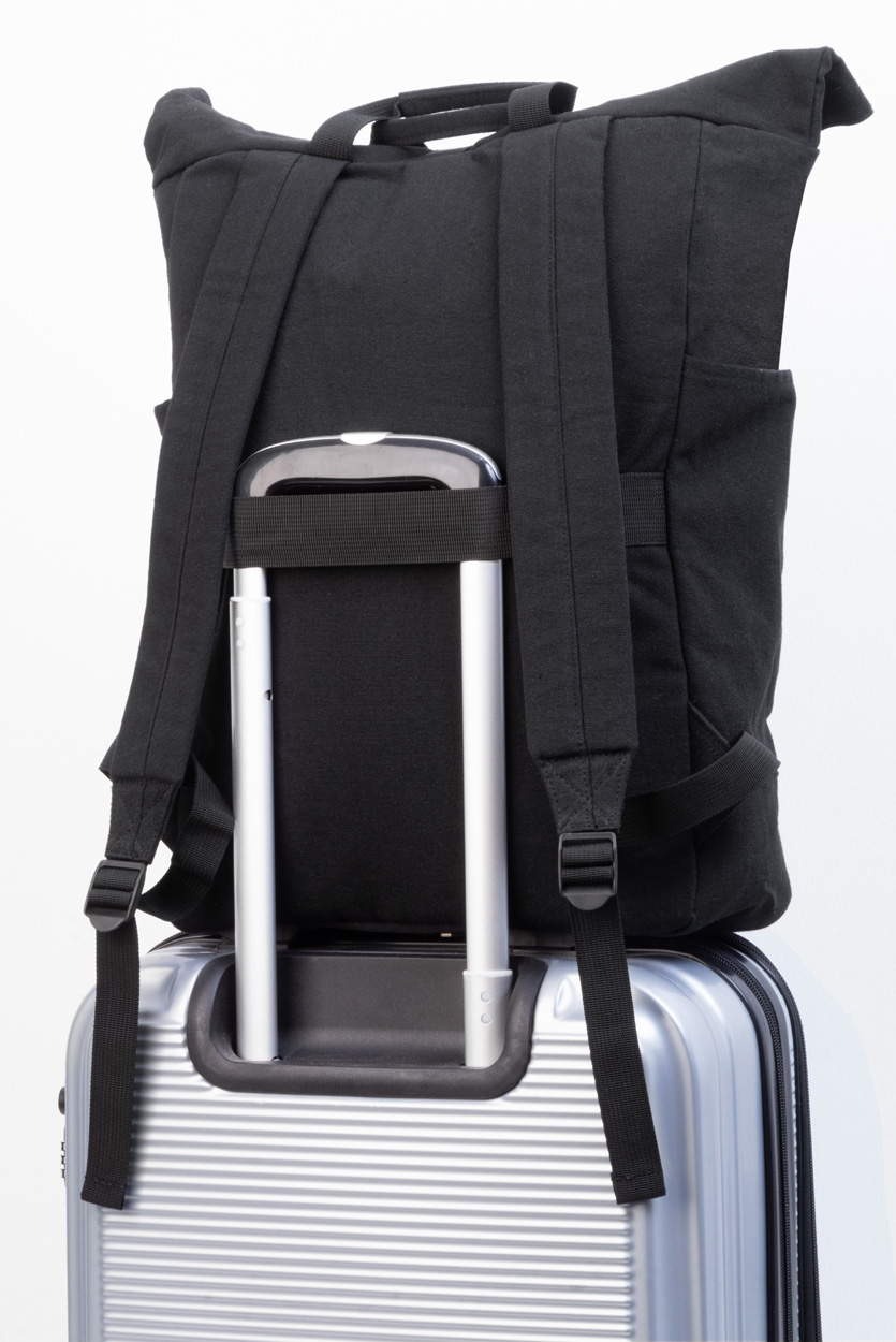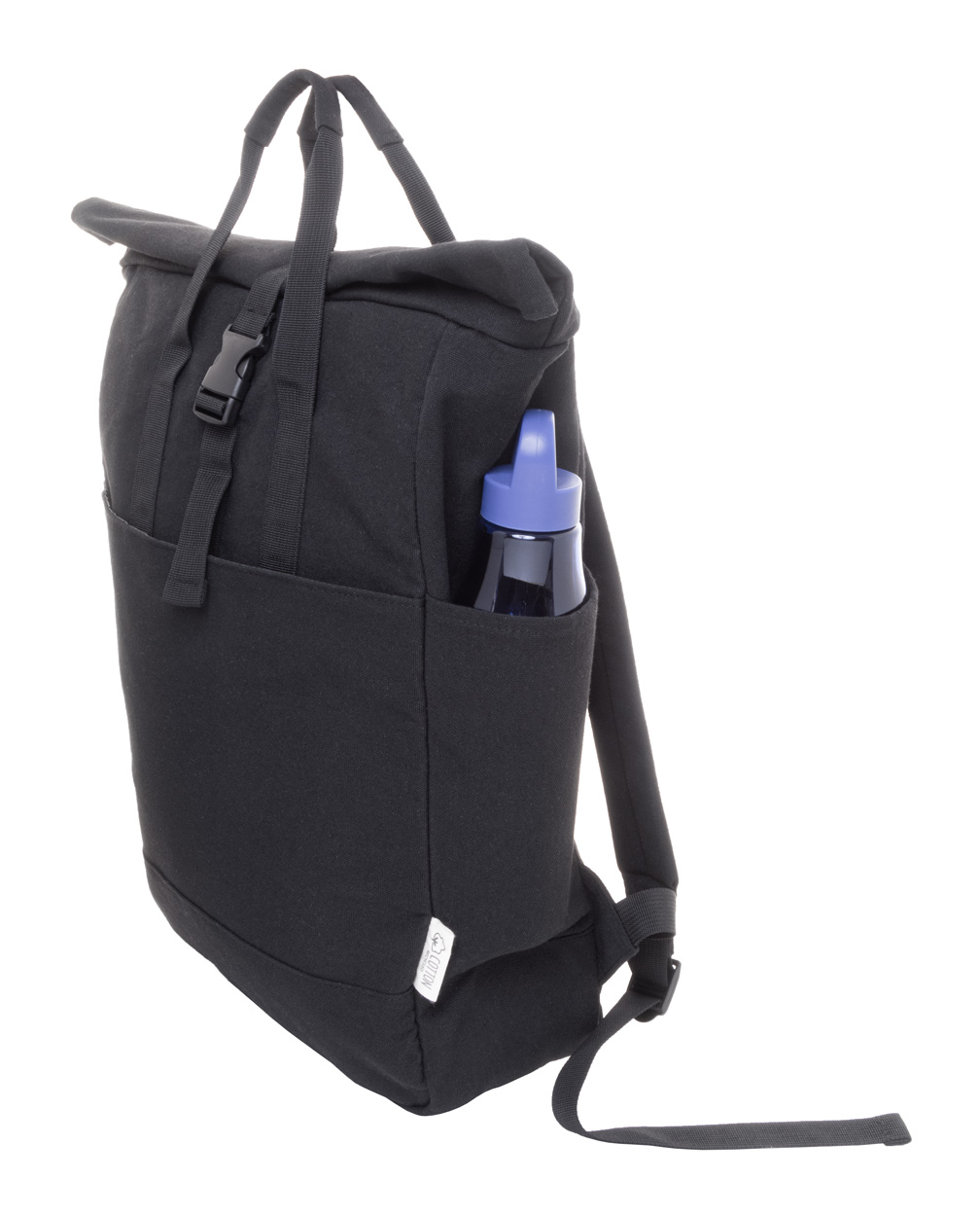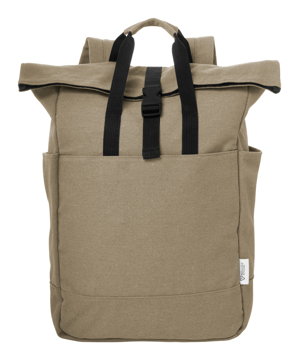 Rolovací batoh z recyklovaného plátna so zapínaním na pracku a suchý zips, polstrovaná priehradka na notebook (15″), predné a bočné vrecká. S popruhom na vozík, polstrovaný chrbát a ramenné popruhy. 70% recyklovanej bavlny a 30% RPET polyesteru. S výrazným štítkom z recyklovanej bavlny.