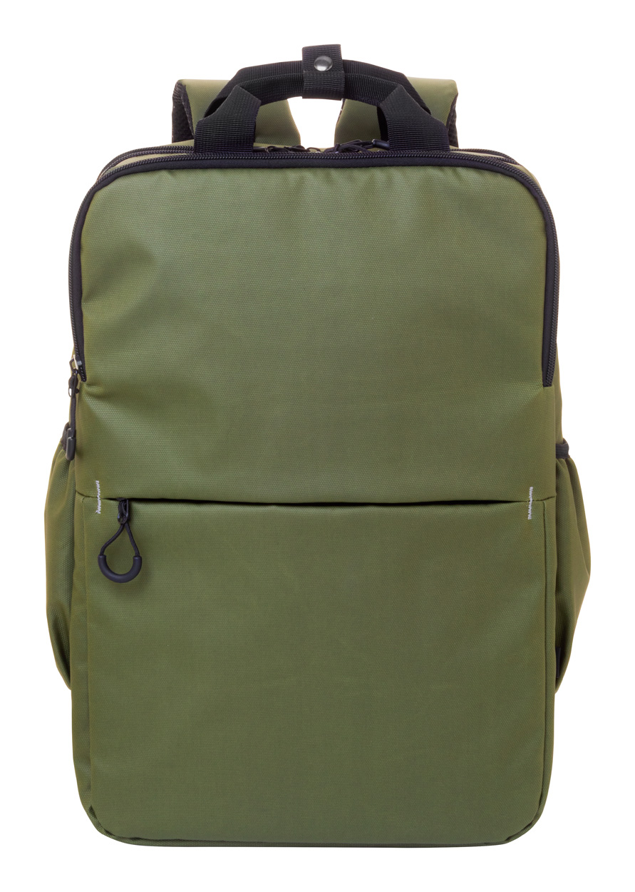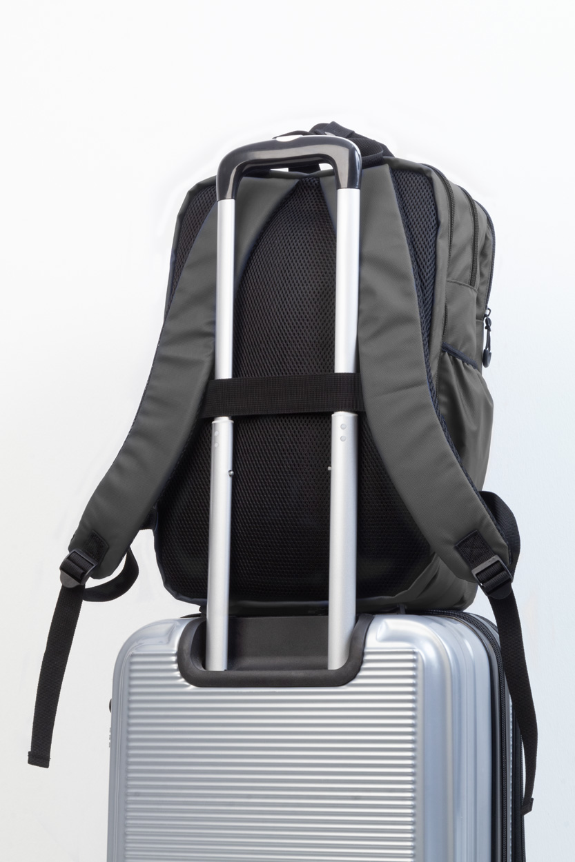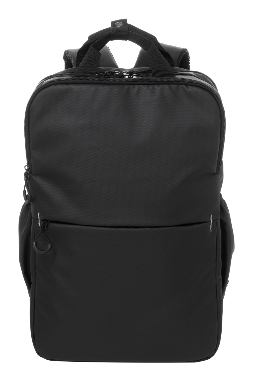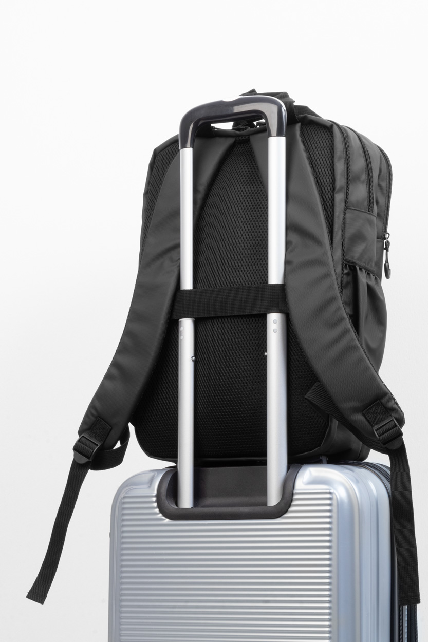 Vodotesný batoh RPET s 2 priehradkami na zips, 2 prednými vreckami na zips, bočnými vreckami a polstrovanou priehradkou na notebook (16″). S popruhom na vozík, polstrovaným chrbtom a ramennými popruhmi. Polyester 600D RPET potiahnutý PU, s výrazným.