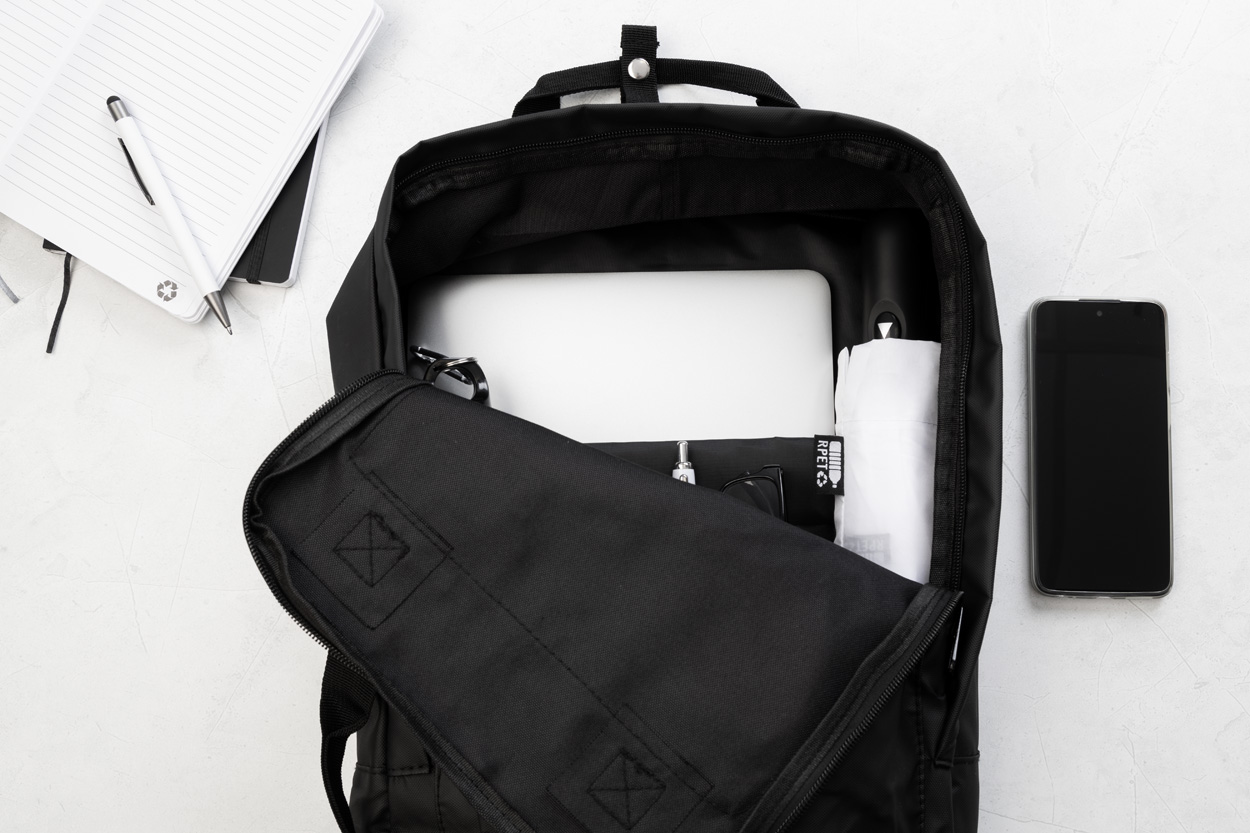 Vodotesný, mäkký batoh z recyklovanej PU kože s hlavným oddielom na zips, 2 prednými vreckami na zips, bočnými vreckami a polstrovanou priehradkou na notebook (15″) a tabliet (10″) S polstrovaným chrbtom a ramennými popruhmi. S výrazným recyklovaným PU štítkom.