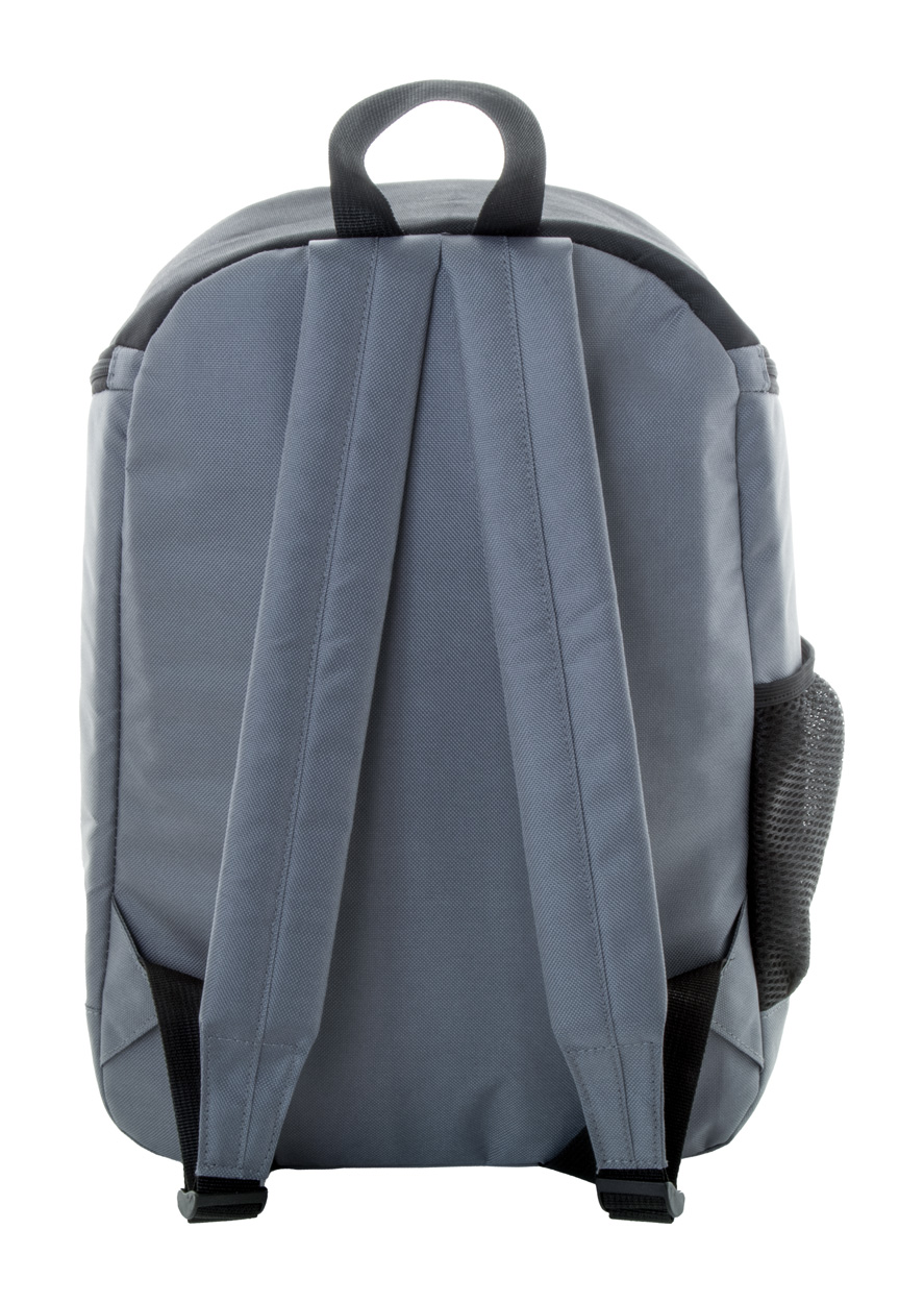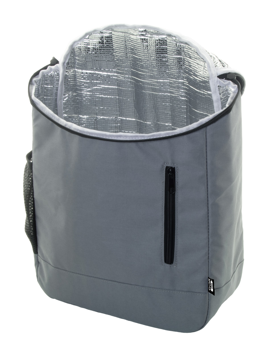 Chladiaci batoh z rPET s hliníkovým polstrovaním, bočným sieťovaným vreckom, hlavnou priehradkou na zips a predným vreckom. Polyester 600D RPET, s výrazným štítkom RPET.