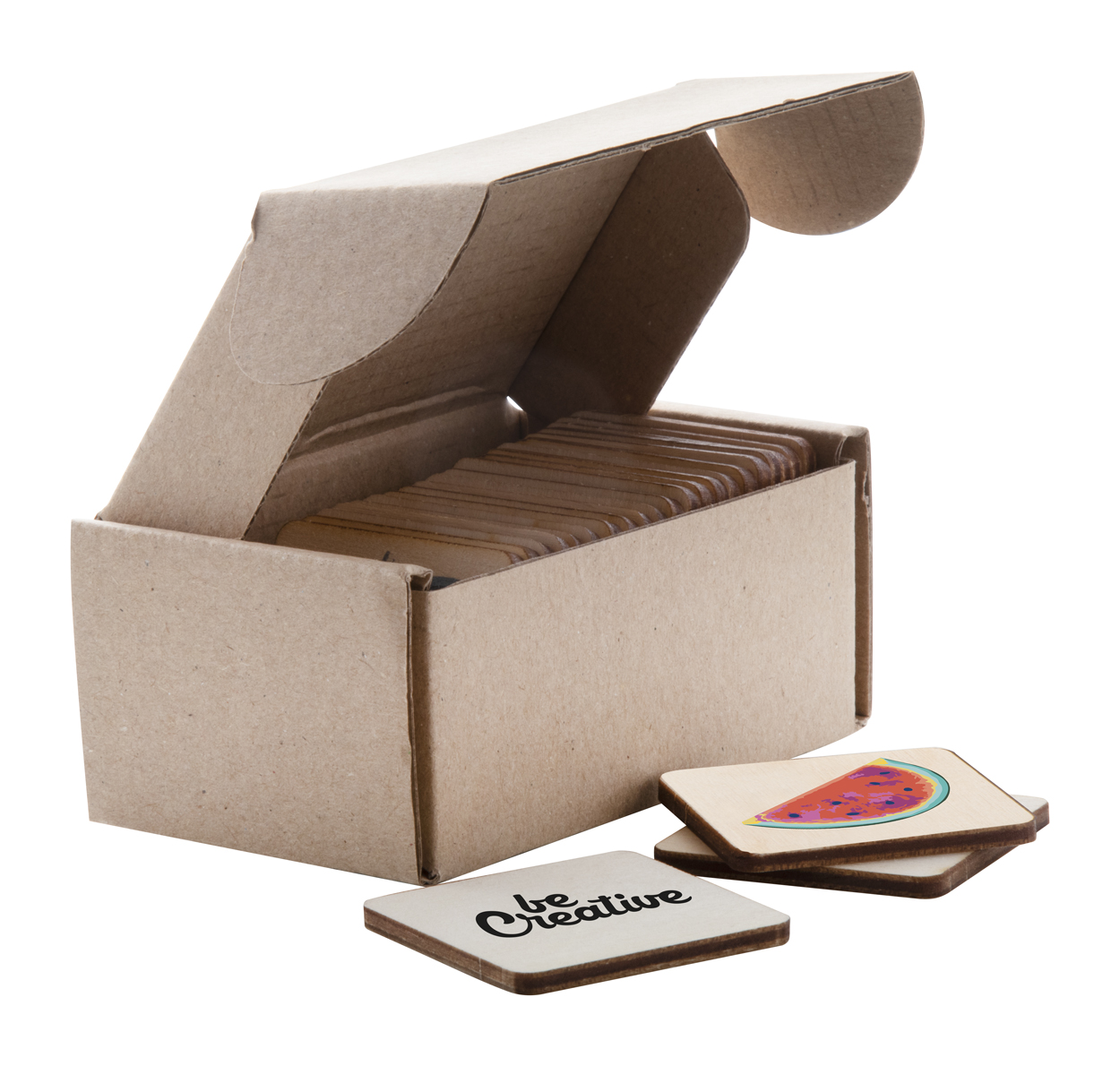 Laminované pexeso z brezy, s vlastnou grafikou. Obsahuje 24 dielov (40 x 40 mm). Cena zahŕňa 12 rôznych plnofarebných potlačí na prednej strane a 1 rovnaký dizajn na zadnej strane všetkých dielov. Nezahŕňa tlačovú prípravu. Min. množstvo: 250 ks.