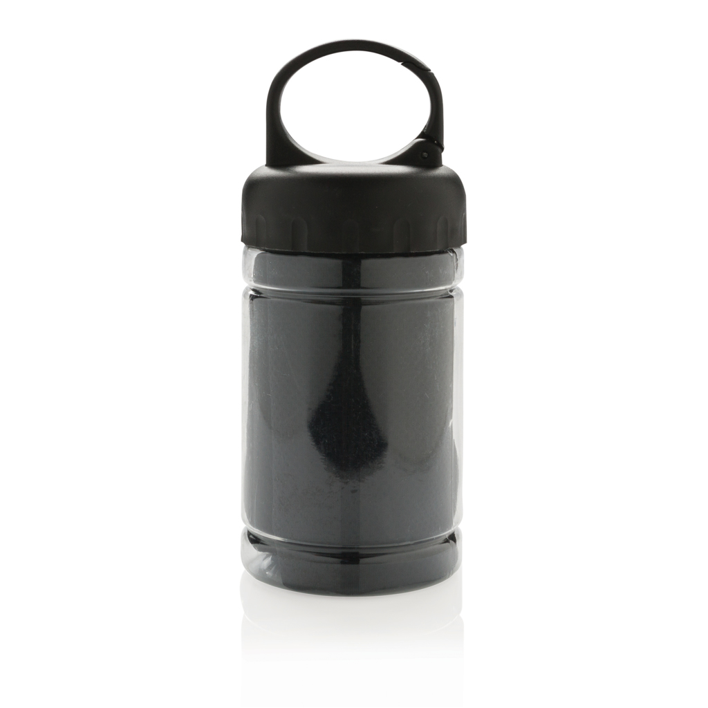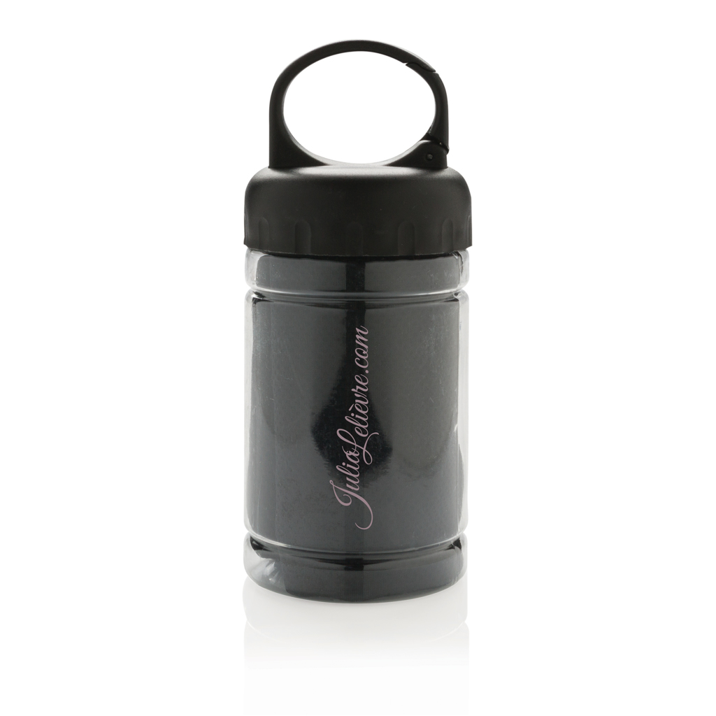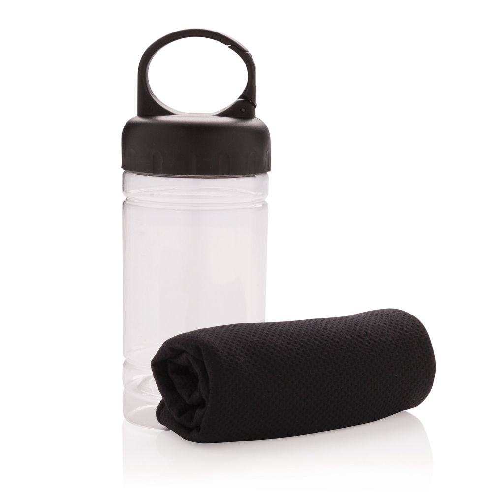 Uterák z mikrovlákna určený na osvieženie pri športe. Jednoducho pridajte studenú vodu do fľaše, čím sa uterák ochladí a pri použití je príjemne osviežujúci. Fľaša je vyrobená z PP s viečkom z ABS s karabínou pre upnutie. Funkcia blokovania až 98% slnečného žiarenia s UV50+ ochranou. Veľkosť uteráka: 77×30 cm.